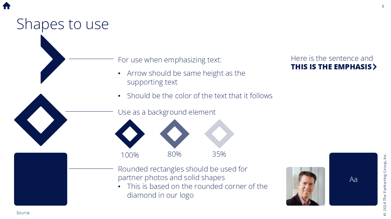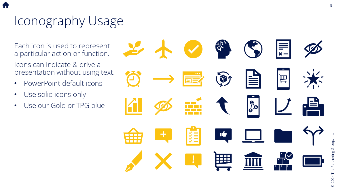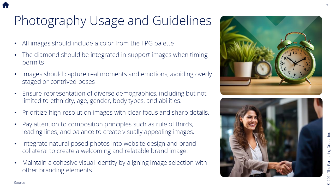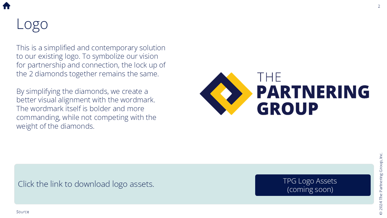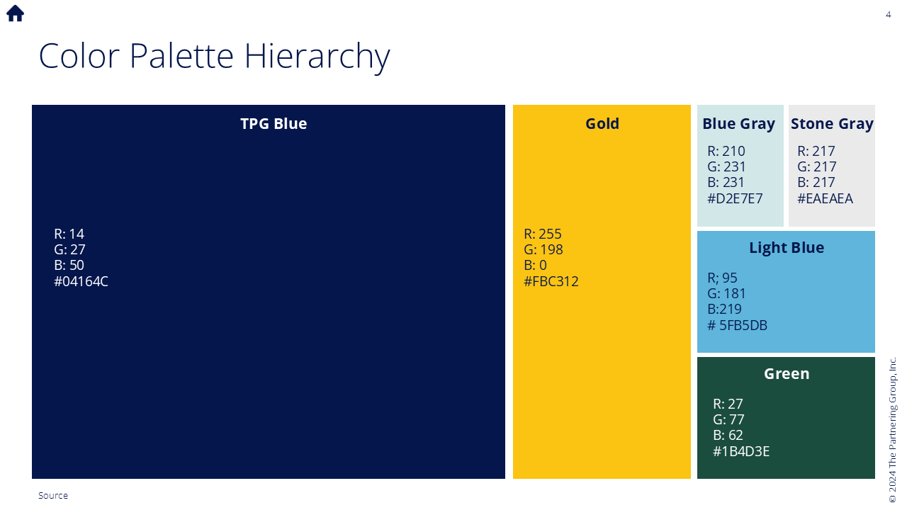 One of the major changes we made to the Style Guide (last updated by myself and the team in 2019) was the color palette. We explored themes that related to the core of the company. The Partnering Group (TPG) is a consulting firm. Keywords such as: longevity, trust, loyalty, profit, energy, and value were a few that influenced the new palette.